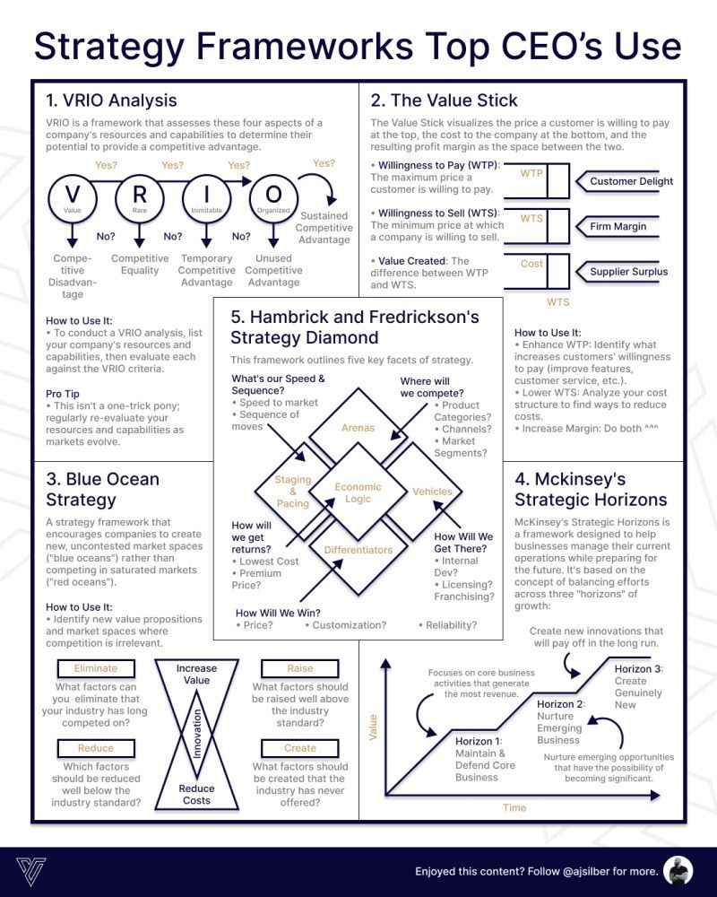 ในโลกของธุรกิจที่เปลี่ยนแปลงรวดเร็ว ความได้เปรียบไม่ได้อยู่ที่ “ขนาดองค์กร” แต่คือ “วิธีคิด” ของผู้นำที่กล้าเปลี่ยนเกม ซีอีโอระดับโลกใช้กรอบกลยุทธ์ (Strategy Frameworks) เหล่านี้เป็นเครื่องมือในการมองอนาคต และตัดสินใจอย่างมีพลัง