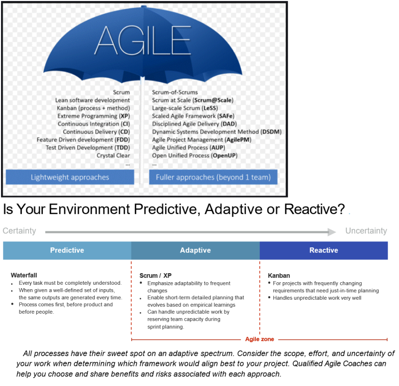 บนภาพชุดแรก เราจะเห็นว่า Agile ไม่ได้มีแค่ Scrum อย่างเดียว แต่เป็น “ร่มใหญ่” ที่รวมหลากหลายแนวทาง เช่น XP, Kanban, SAFe, LeSS, DAD ฯลฯ สิ่งที่ซ่อนอยู่คือ …